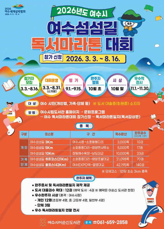 시 관계자는 “여수섬섬길 독서 마라톤 대회는 독서를 일상 속 즐거운 도전으로 만들어 시민들이 자연스럽게 책과 가까워질 수 있도록 기획한 프로그램”이라며 “가족과 이웃이 함께 참여하는 독서문화 확산의 계기가 되길 기대한다”고 말했다.