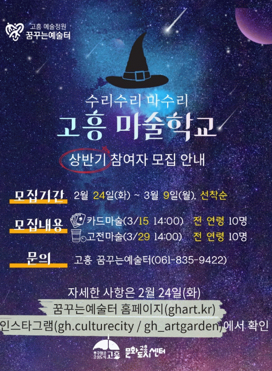 고흥군 문화도시센터 권지애 센터장은 “마술은 생애주기별 발달 과정에서 중요한 창의력과 집중력 향상, 자신감 형성에 도움을 주는 예술 장르”라며 “누군가에게 작은 놀라움을 선물할 수 있는 마술의 매력을 직접 경험해 보시기를 바란다”고 말했다.