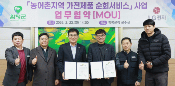 함평군은 “지난 23일 군청에서 LG전자 고객가치혁신 한국서남부담당과 ‘농어촌지역 가전제품 순회서비스 사업’ 운영을 위한 업무협약(MOU)을 체결했다”고 24일 밝혔다.
