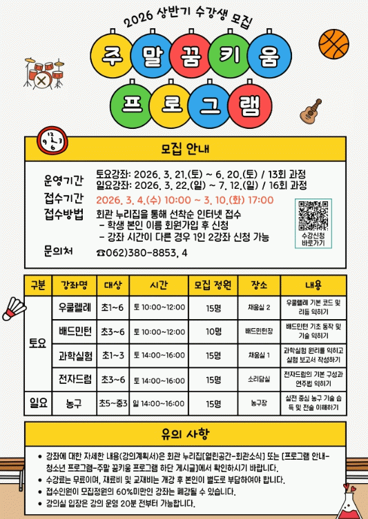 토요일 과정은 총 13회 운영되며 문화예술활동(우쿨렐레, 전자드럼)과 배드민턴 등 신체 활동, 과학실험 탐구로 구성됐다.