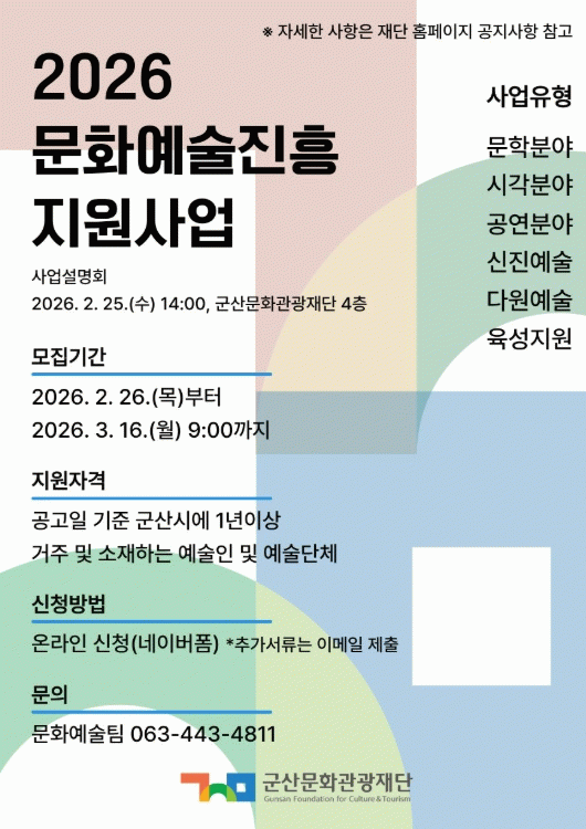 공모와 관련한 자세한 사항은 군산문화관광재단 누리집-공지사항에서 확인할 수 있으며, 문의는 재단 문화예술팀으로 하면 된다.