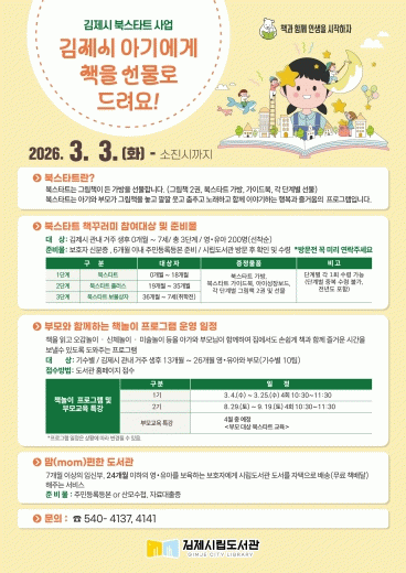 참여를 희망하는 보호자는 신분증과 6개월 이내 발급된 주민등록등본을 지참해 김제시립도서관, 금구도서관을 방문해 신청하면 된다.