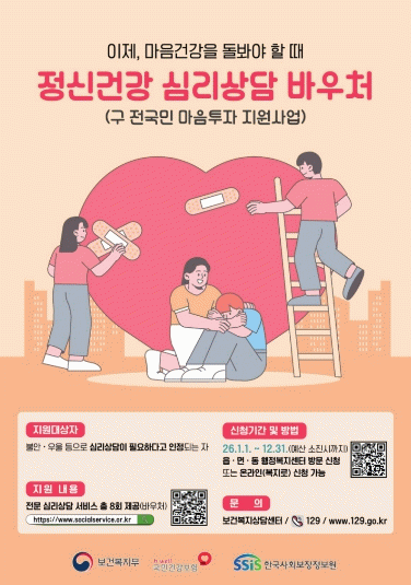이 사업은 올해부터 기존 ‘전국민 마음투자 지원사업’에서 사업명을 변경했으며, 정신건강복지센터·자살예방센터 등록회원은 별도 검사 절차 없이 등록증명서만 소지하면 서비스를 이용할 수 있도록 해 시민 편의성을 높였다.