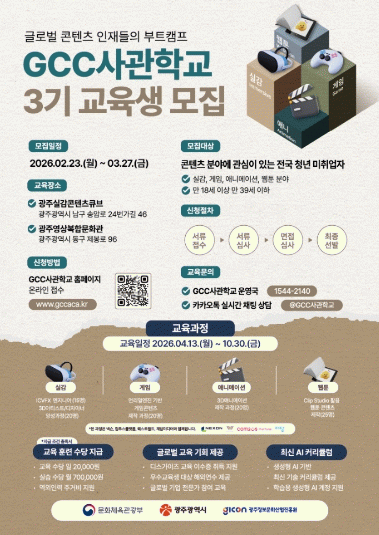 3기 교육생 모집은 GCC사관학교 공식 누리집을 통해 진행하며, 콘텐츠 분야에 관심 있는 만 18세부터 39세까지의 전국 청년 미취업자이면 누구나 지원할 수 있다.