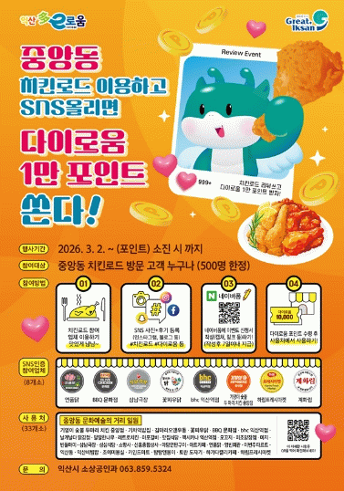 익산시는 3월 2일부터 선착순 500명을 대상으로 '중앙동 치킨로드 SNS 인증 이벤트'를 운영한다고 26일 밝혔다.