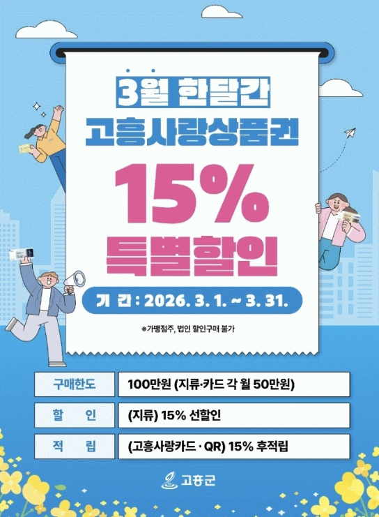 이번 특별할인은 지난 1~2월 진행된 ‘새해맞이 고흥사랑상품권 특별할인 행사’가 두 달 만에 판매액 100억 원을 돌파하는 등 뜨거운 호응을 얻음에 따라, 민생경제의 활력을 이어가기 위해 마련됐다.