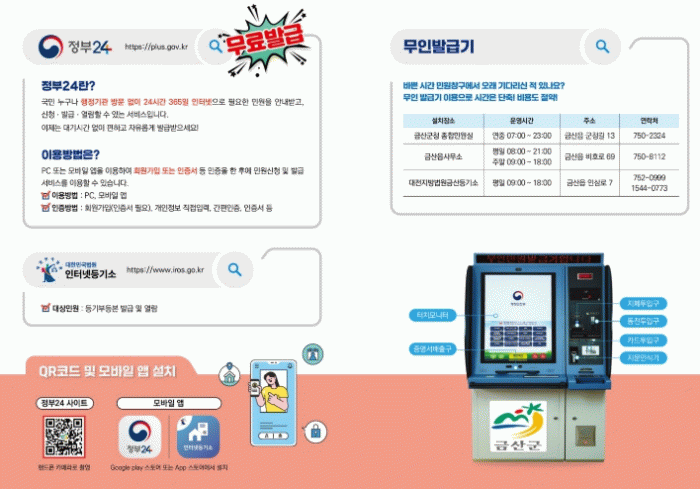 무인민원발급기는 읍면 행정복지센터를 비롯해 금산군청 종합민원실, 대전지방법원 금산등기소 등에 설치돼 있으며 평일 오전 9시부터 오후 9시까지 이용할 수 있고 수수료는 창구 수수료의 50%다.