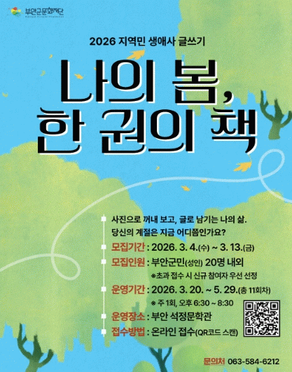부안군문화재단 관계자는 “지역민 한 사람 한 사람의 삶은 곧 부안의 역사이자 소중한 문화 자산”이라며, “이번 프로그램을 통해 자신의 삶을 기록으로 남기고 이웃과 그 가치를 나누는 뜻깊은 계기가 되길 바란다”고 전했다.