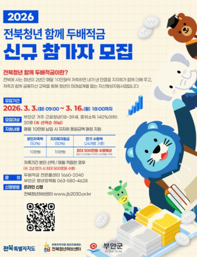 군 관계자는 “두배적금 사업을 통해 일하는 청년들이 스스로 자산을 형성하고 경제적 기반을 다질 수 있기를 바란다”며 “앞으로도 청년들이 지역에 정착해 안정적으로 생활할 수 있도록 체감도 높은 청년정책을 지속 추진하겠다”고 말했다.