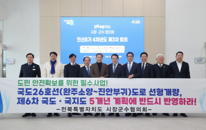 전춘성 진안군수는 “완주 소양에서 진안 부귀 구간은 급커브와 급경사 구간이 연속된 대표적인 선형불량 구간으로, 교통사고 위험이 상존하고 있다”며 “도민의 생명과 안전 확보는 물론, 전북 동부권 균형발전을 위해 국가 차원의 적극적인 사업 반영이 필요하다”고 건의 안건을 설명했다.
