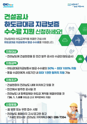 전남도는 제도 실효성을 높일 필요가 있다는 의견을 반영해 2026년부터 지원 비율을 기존 50%에서 최대 100%로 올려 하도급 업체의 금융 부담을 줄이고 원·하도급 간 대금 지급의 안정성을 높인다는 방침이다.