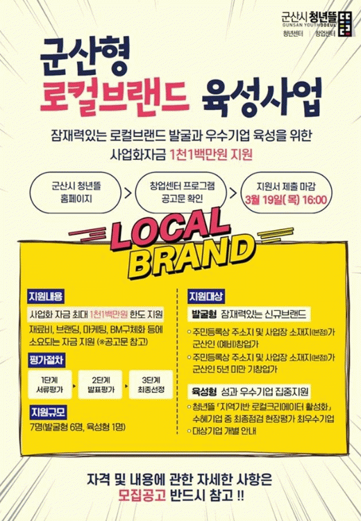 창업센터는 오는 3월 19일 오후 4시까지 ‘2026 군산형 로컬브랜드 육성사업’ 참여자를 모집한다고 밝혔다.
