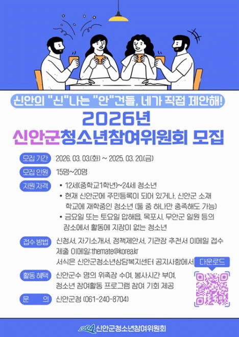 모집 대상은 청소년 정책에 관심 있는 신안군 거주 청소년 또는 관내 중·고등학교 재학생 전원이다. 지원 기간은 3월 3일부터 3월 20일까지로, 관심 있는 청소년이라면 누구나 도전할 수 있다.