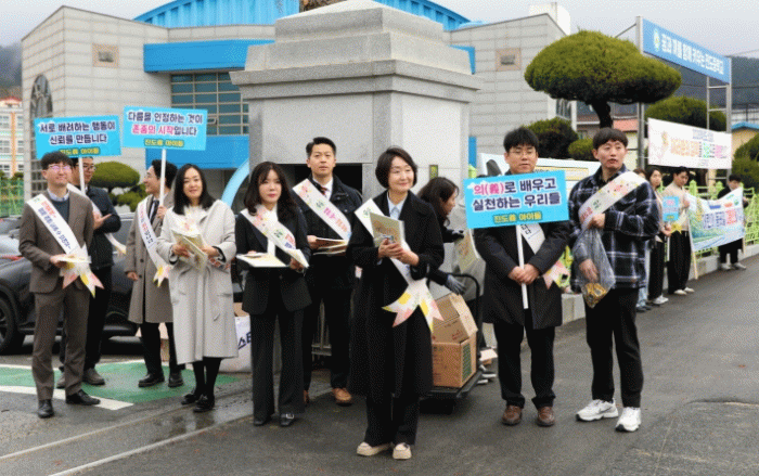 이날 행사에는 하숙자 교육장을 비롯해 교육지원청 관계자, 진도군청, 진도경찰서, 진도중학교 교직원, 학부모회와 진도중 학생자치회 학생 등이 참여해 등교하는 학생들에게 인사와 응원의 메시지를 전했다. 참가자들은 ‘서로 배려하는 행동이 신뢰를 만듭니다’, ‘다름을 인정하는 것이 존중의 시작입니다’라는 문구가 적힌 피켓 등을 활용하여 캠페인 활동을 펼쳤다.