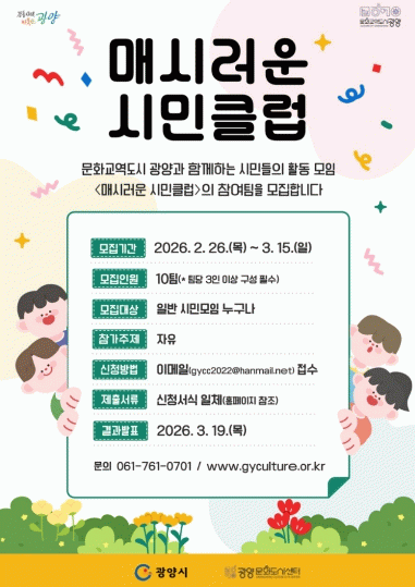 '매시러운 시민클럽' 7기 신청은 3월 15일 자정까지 전자우편으로 접수한다. 서류 심사를 거쳐 3월 19일 최종 참가팀을 발표할 예정이다. 신청 서식은 광양문화도시센터 누리집에서 내려받을 수 있다. 자세한 사항은 광양문화도시센터로 문의하면 된다.