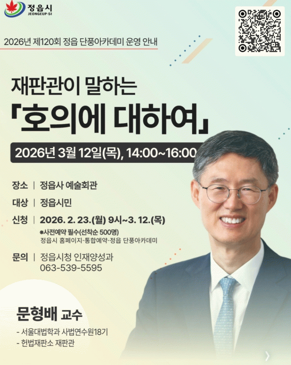 이번 강연은 정읍 시민이라면 누구나 무료로 참여할 수 있다. 수강을 희망하는 시민은 행사 전까지 정읍시청 누리집(홈페이지)에 접속해 통합예약 시스템 메뉴에서 ‘단풍아카데미’를 선택해 간편하게 신청하면 된다.