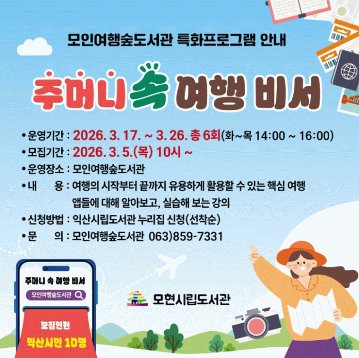익산시는 모인여행숲도서관에서 오는 17일부터 26일까지 '주머니 속 여행 비서 : 여행 앱의 모든 것' 프로그램을 운영한다고 4일 밝혔다.