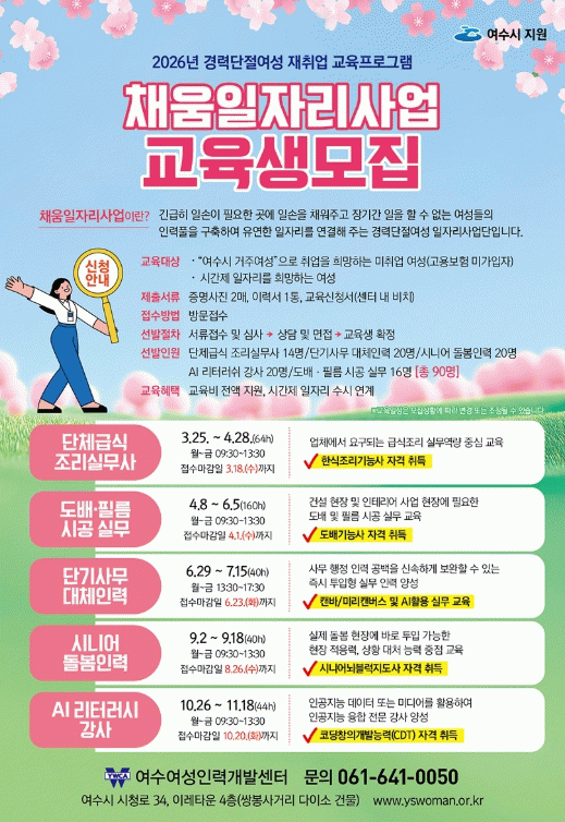 모집 대상은 여수시에 거주하며 취업 희망 미취업 여성(고용보험 미가입자)과 시간제 일자리를 희망하는 여성이다.