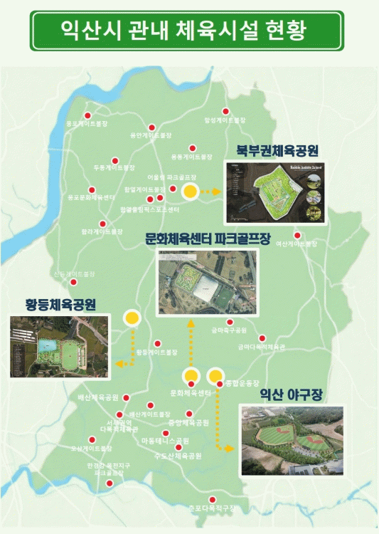 기존 파크골프장을 18홀에서 36홀로 늘리고 족구장과 녹지 공간을 더해 시민 쉼터로 탈바꿈시킨다. 황등면에도 축구장과 산책로를 갖춘 복합 체육공간이 들어설 예정이다.
