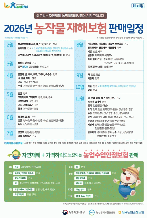 품목별로 가입 기간이 다르므로 가까운 지역농협을 방문하여 상담 후 신청하면 된다.