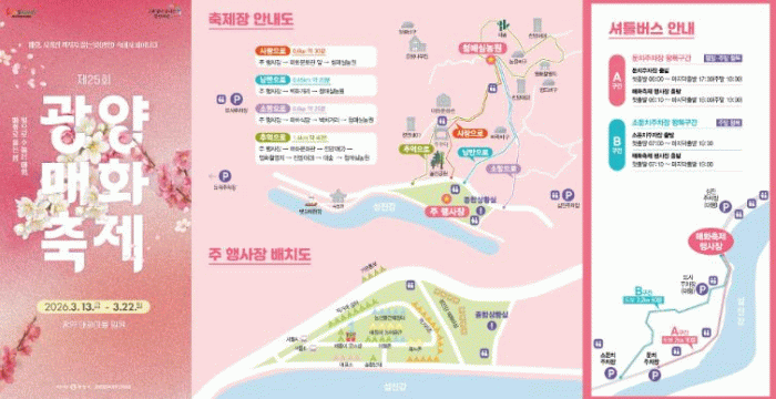 광양시 관계자는 “이번 축제는 입장부터 주차, 셔틀버스까지 전 과정에서 방문객 안전과 편의를 최우선으로 고려해 준비하고 있다”며 “무료 셔틀과 도심권 셔틀 운영을 통해 교통 혼잡을 줄이고 누구나 편리하게 찾을 수 있는 축제 환경을 조성하겠다”고 말했다.