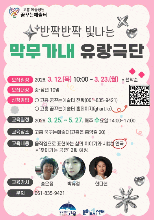 참가 신청은 3월 12일부터 고흥 꿈꾸는예술터 홈페이지 또는 전화로 할 수 있으며, 고흥군에 거주하는 중장년층이라면 누구나 참여 가능하다.