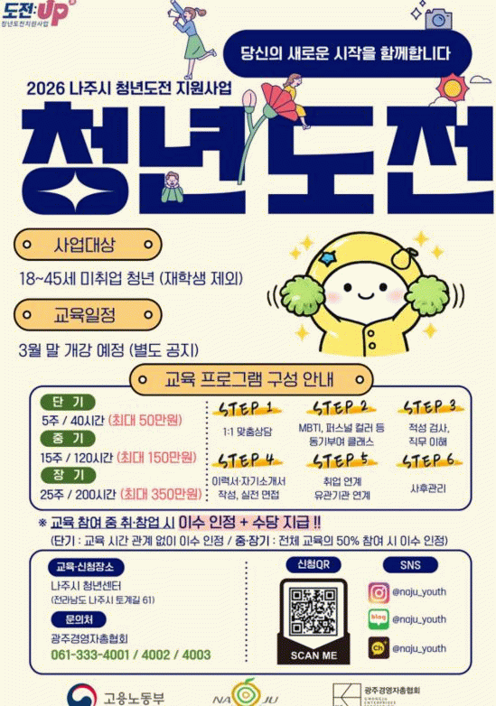 나주시와 광주경영자총협회가 주관하는 이번 사업은 최근 6개월간 취업이나 교육, 직업훈련 참여 이력이 없는 18세부터 45세까지의 구직단념 청년과 자립준비 청년, 청소년 쉼터 입‧퇴소 청년 등을 대상으로 한다.