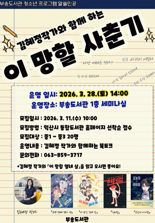 시 관계자는 "청소년들이 작가와의 만남을 통해 사춘기에 대한 고민을 자연스럽게 풀어내고, 책을 매개로 서로의 이야기를 나누는 시간이 되길 바란다"며 "많은 관심과 참여를 기대한다"고 말했다.