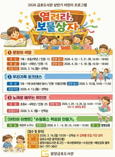 한편, 2026년 금호도서관 상반기 어린이 프로그램과 관련한 자세한 사항은 광양시립도서관 누리집에서 확인하거나 금호도서관으로 문의하면 안내받을 수 있다.
