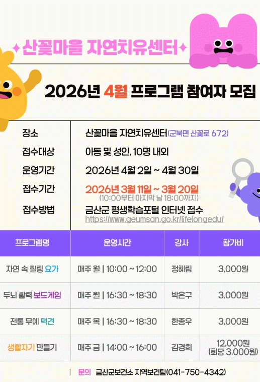 산꽃마을 자연치유센터 프로그램에 관한 자세한 내용은 금산군보건소 지역보건팀에 문의하면 된다.