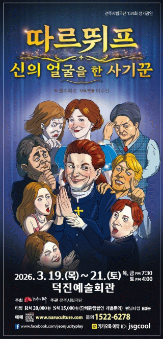 이번 작품은 프랑스 고전 희극의 거장 몰리에르(Molière)의 대표작 ‘따르뛰프’를 전주시립극단만의 시선으로 새롭게 해석한 작품으로, 위선적인 신앙과 권력, 인간의 욕망을 날카로운 풍자와 유머로 풀어낸다.