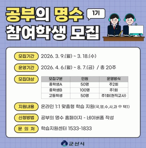 ‘공부의 명수’는 군산시가 운영하는 공공학습 플랫폼으로, 학생들의 학습 수준과 진로에 맞는 다양한 교육 서비스를 제공해 자기주도 학습 역량을 높이고 교육 복지 실현을 위해 추진하는 사업이다.