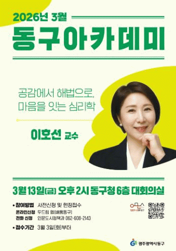 동구 관계자는 “동구 아카데미는 단순한 강연 프로그램을 넘어 배움을 통해 지역사회가 함께 성장하는 데 중요한 역할을 해 왔다”며 “올해도 의미 있는 강연들을 통해 주민들께 새로운 지식과 통찰을 전하고, 배움과 나눔의 가치를 널리 확산할 수 있도록 최선을 다하겠다”고 말했다.