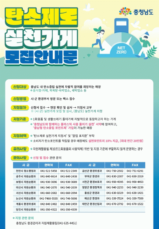 지정 기준은 1회용품 및 생활쓰레기 줄이기에 자발적으로 동참하고 충남형 탄소중립 포인트제 가입이 가능하면 된다.