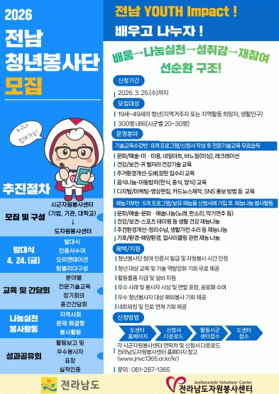 모집 대상은 봉사활동에 관심이 있는 19~49세 청년으로, 지역 사회에 긍정적인 변화를 만들어가고 싶은 청년이라면 누구나 참여할 수 있다.