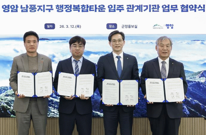 12일 영암군은 군청에서 서부지방산림청 영암국유림관리소, 국민건강보험공단 영암지사, NS종합건설과 ‘남풍지구 행정복합타운 입주 업무협약’을 체결했다.