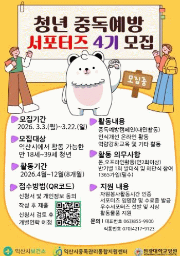 한편 익산시중독관리통합지원센터는 서포터즈 운영을 비롯해 4대 중독 선별검사, 상담, 예방 교육, 인식 개선 캠페인 등 다양한 중독 예방사업을 진행하고 있다.
