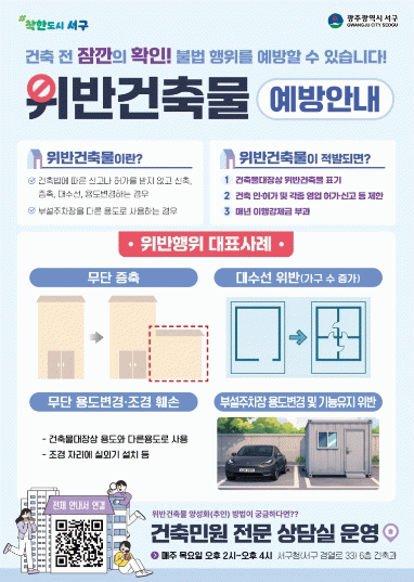 또 사용승인 이후 2년 이내 건축법 위반행위가 집중 발생하는 점을 고려해 건축물 사용승인 단계에서 건축주에게 예방 사례집을 직접 발송하는 등 사전 안내를 강화할 계획이다. 사례집은 서구청 누리집에도 게시해 누구나 확인할 수 있도록 할 예정이다.
