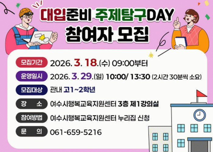 참여를 희망하는 학생은 여수시행복교육지원센터 누리집에서 사전 신청 후 참여할 수 있으며 참여 학생에게는 주제탐구 가이드 자료 등이 제공된다.