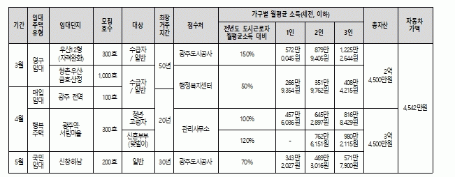 5월에는 ‘국민임대주택’ 신청이 광주도시공사를 통해 진행된다. 월평균소득 70% 이하 세대가 대상이며, 신창지구 66형(20평형)과 하남지구 79형(24평형) 등에서 요건 충족 시 최장 30년 거주가 가능하다.