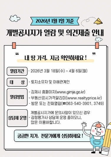 제출된 의견은 토지특성, 표준지 및 인근 토지 지가와의 균형 등을 재조사하고 감정평가법인의 재검증과 김제시 부동산가격공시위원회 심의를 거치게 된다. 처리 결과는 의견제출인에게 개별 통지되며, 최종 개별공시지가는 4월 30일에 결정 공시될 예정이다.