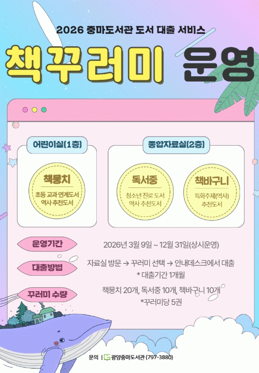 ‘맞춤형 책 꾸러미 서비스’에 대한 자세한 사항은 광양중마도서관으로 문의하면 된다.