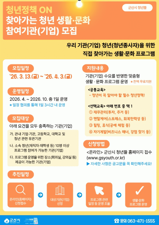 현재 모집은 4월 3일까지 진행되며, 참여를 희망하는 기관(기업)은 군산시 청년뜰 누리집을 통해 온라인으로 신청할 수 있다. 자세한 사항은 누리집 공고문을 참고하거나 청년지원팀으로 문의하면 된다.