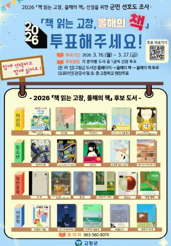 고미숙 고창군 문화예술과장은 “군민들과 함께 책을 선정하고 읽는 과정에서 문화적 공감대를 넓히고 독서의 즐거움을 나누는 소중한 기회”라며 “더 많은 군민이 이번 선호도 조사에 적극 참여해 주기를 바란다”고 전했다.
