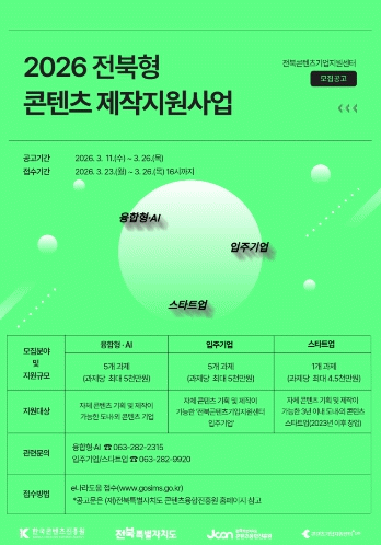 2026년도 전북콘텐츠기업지원센터 지원사업은 콘텐츠의 제작부터 고도화와 시장 진출로 이어지는 선순환 구조를 구축해 지역 콘텐츠 산업의 지속 가능한 성장 환경 조성을 목표로 설계했으며, 자세한 내용은 진흥원 홈페이지 공지사항에서 확인할 수 있다.