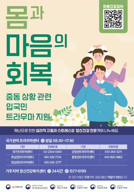 지원 대상은 중동지역 상황으로 정신적 피해를 입은 입국민과 재외동포, 전쟁 관련 소식 등으로 심리적 어려움을 겪고 있는 지역 주민이다.