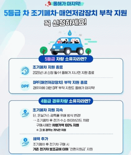 또한 배출가스 5등급 경유차에 매연 저감장치(DPF)를 설치하면 설치비의 약 90%를 지원하며, 건설기계(덤프트럭) 매연 저감장치 설치와 지게차·굴삭기·롤러·로더 엔진 교체 비용은 전액 지원한다.