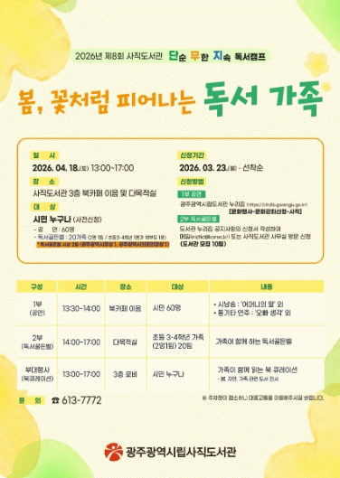 이 행사는 ‘봄, 꽃처럼 피어나는 독서 가족’을 주제로, 가족이 책을 통해 소통하며 독서의 즐거움을 나누고, 도서관 중심의 가족 독서 문화를 확산하기 위해 마련했다.
