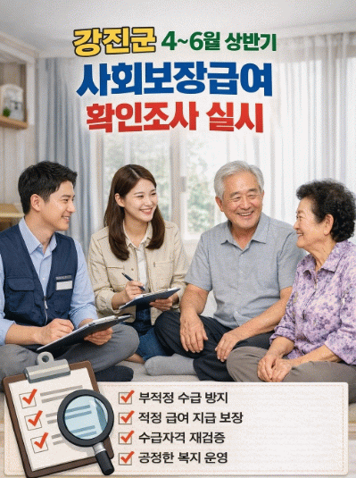 강진군은 조사 과정에서 대상자에게 충분한 소명 기회를 제공하고 자격 변동이 예상되는 가구에는 사전 안내와 상담을 진행하는 한편, 생활 여건이 급격히 악화한 위기가구는 적극 발굴해 긴급복지 등 맞춤형 지원으로 연계함으로써 군민의 수급권 보호와 복지 사각지대 해소에 힘쓸 방침이다.