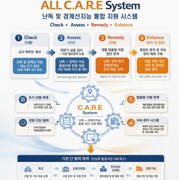 담임교사와 학부모가 선별 체크리스트를 활용해 초기 진단을 실시하고, 학습종합클리닉센터와 연계한 심층검사를 통해 학생의 인지 특성을 정밀하게 파악한다.